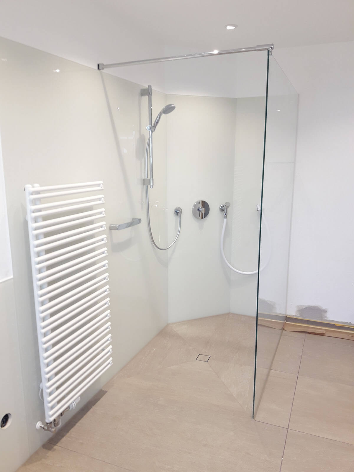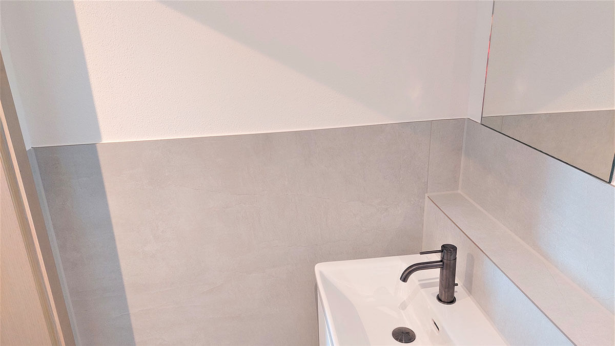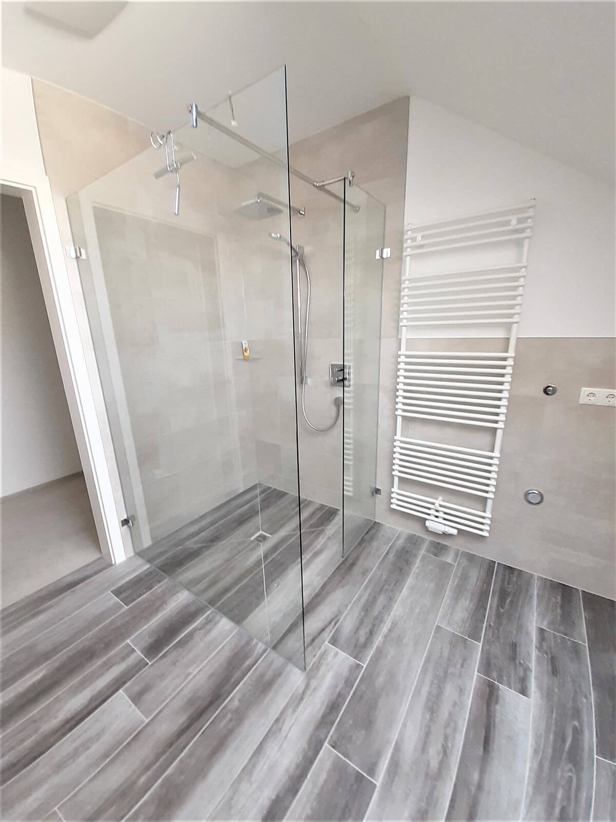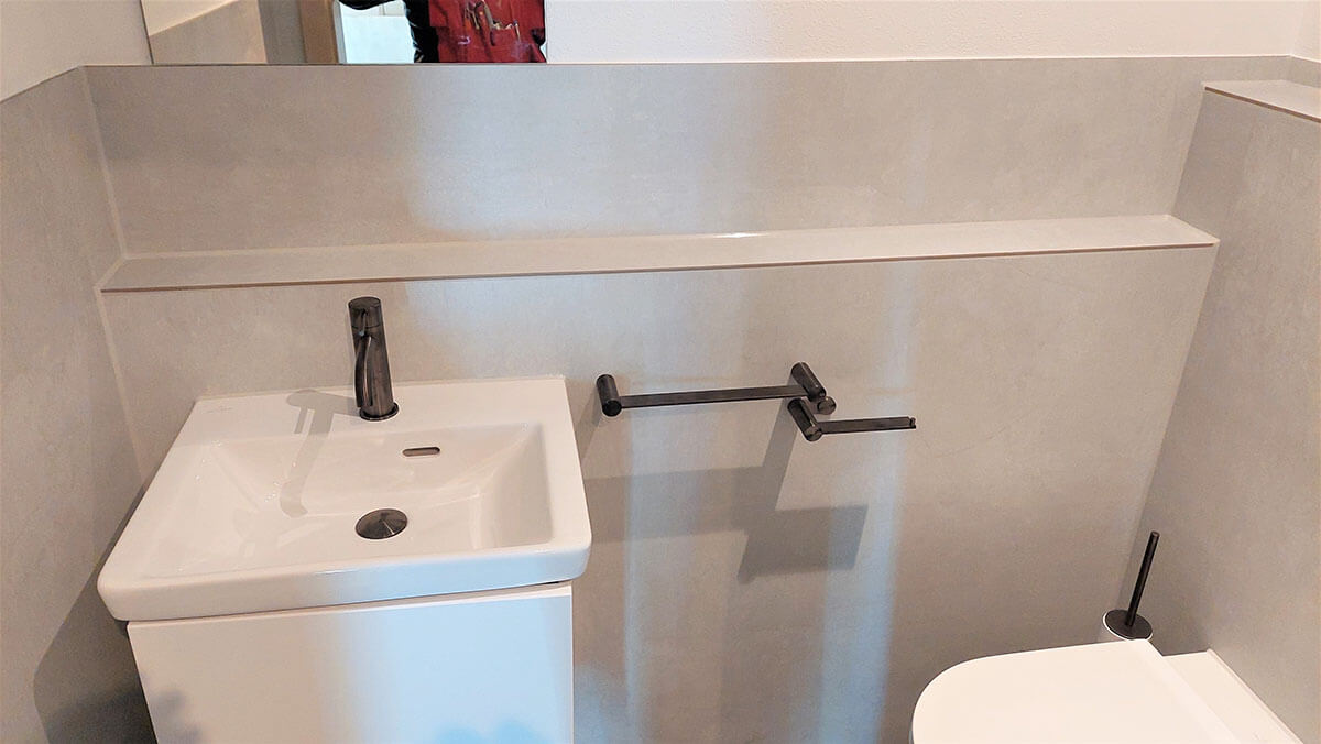 Je nach Anforderung kombiniere ich Glasduschkabine, Glasrückwand, große Fließen oder Rückwand‑Systeme (z. B. Trespa) mit passenden Fugenlösungen. Ergebnis: modern, fugenarm, pflegeleicht und dauerhaft dicht.