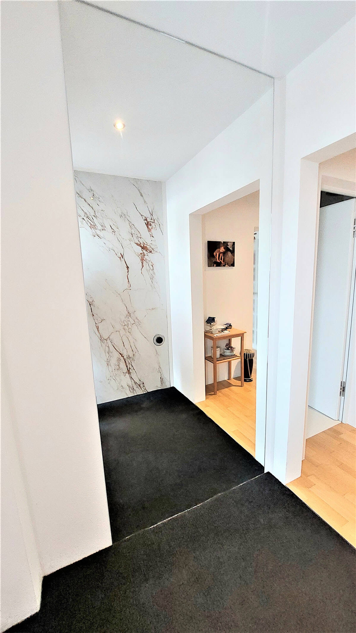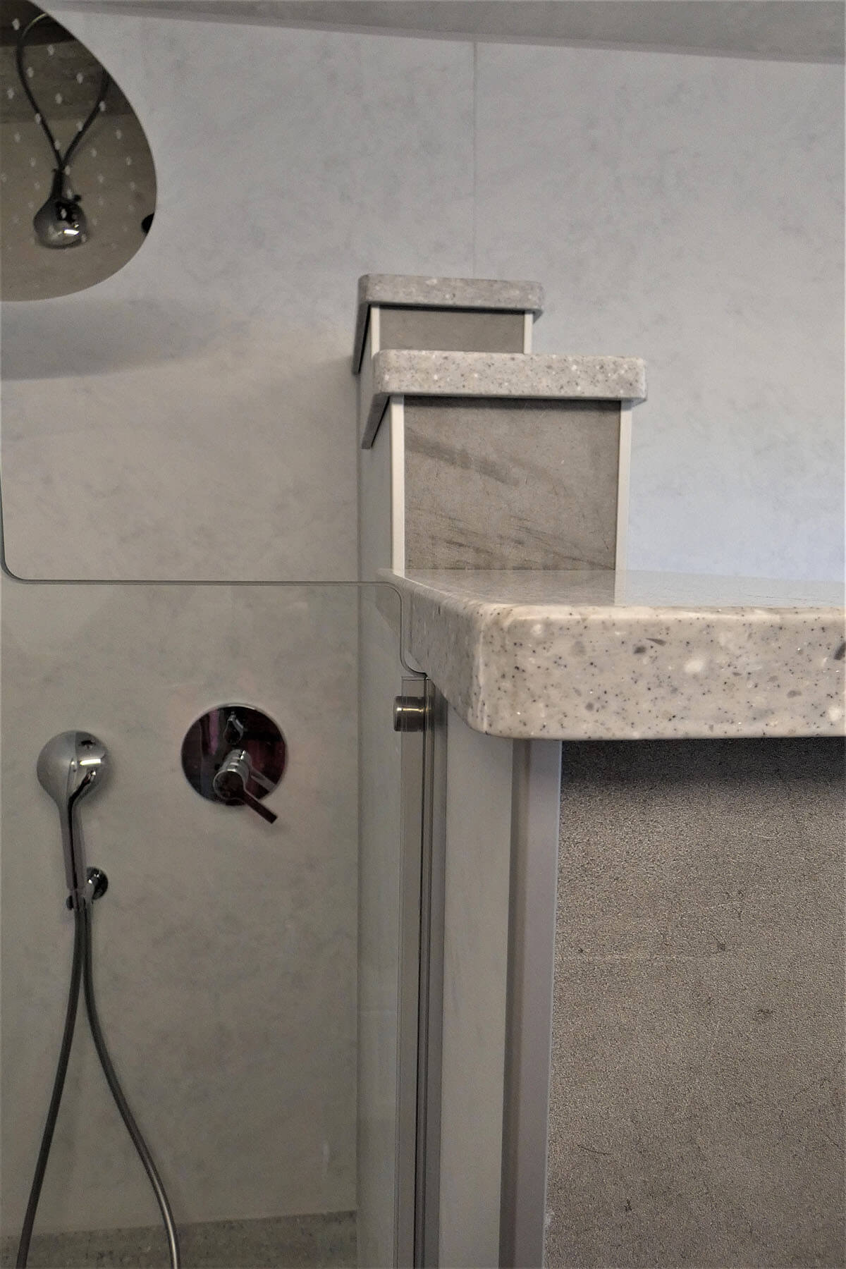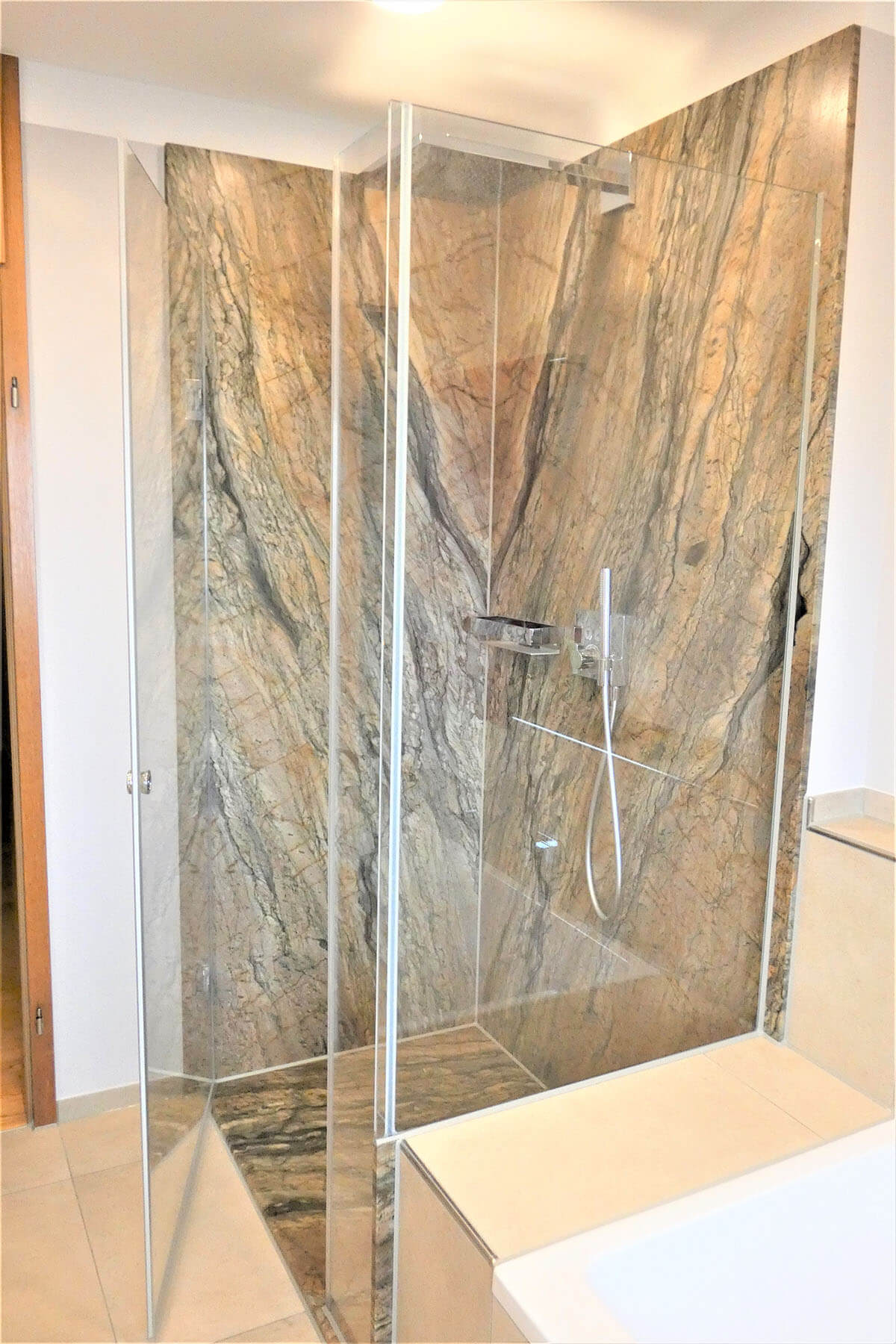 Je nach Anforderung kombiniere ich Glasduschkabine, Glasrückwand, große Fließen oder Rückwand‑Systeme (z. B. Trespa) mit passenden Fugenlösungen. Ergebnis: modern, fugenarm, pflegeleicht und dauerhaft dicht.